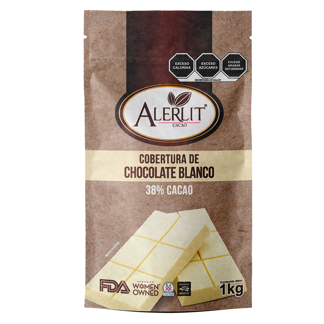 Cobertura de Chocolate Blanco 38% Cacao Alerlit (1kg). Calidad profesional para el repostero exigente. Sabor lácteo refinado y una cremosidad superior gracias a su alto contenido de manteca de cacao. Ideal para bombones, mousses y repostería fina.